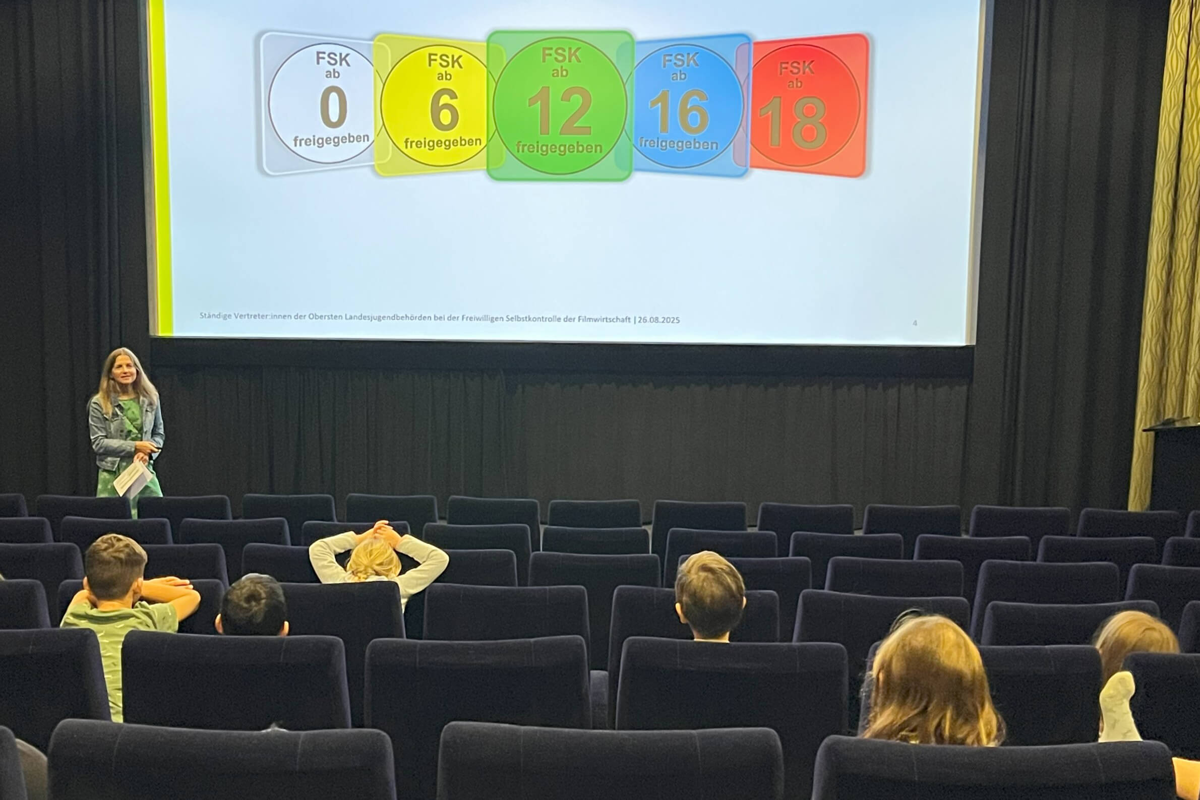 Isabell Tatsch, Ständige Vertreterin der Obersten Landesjugendbehörden bei der FSK, fasste die Herangehensweise zusammen: „In der Veranstaltung konnten sich die Grundschüler:innen durch den Einsatz verschiedener Methoden – vom freien Austausch über die spielerische und kreative Auseinandersetzung – mit der Wirkung von filmischen Inhalten befassen.“ Ihr Kollege Michael Schmidt ergänzte: „Es war ein erkenntnisreicher Austausch mit einer Altersgruppe, die in den Prüfverfahren der FSK besondere Aufmerksamkeit erhält. “.