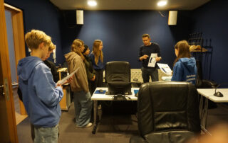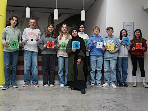 v.l.n.r.: Lilly, Peter Kaun (FSK), Anne Wen (Studienrätin), Anselm, Moiye, Aaron, Gino, Hla, Sajia, Helen, Arndt Klingelhöfer (medienpädag. Fachkraft), Katharina, Clara Fink (medienpädag. Fachkraft), Isabell Tatsch (OLJB), Jan Benedyczuk (HSM), Michael Schmidt (OLJB), Madeleine Charlet (HSM)